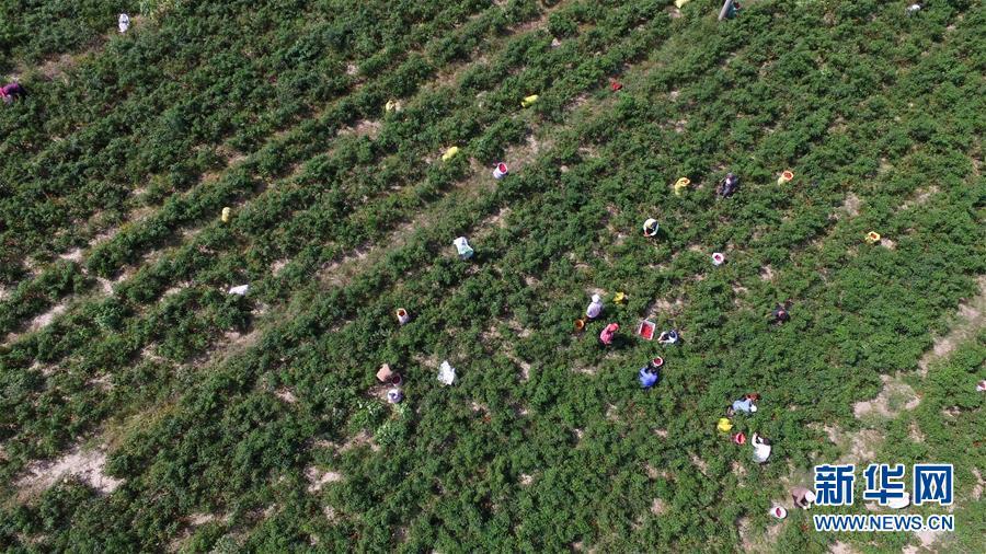 9月16日,阜城縣王集鄉(xiāng)南張莊村農(nóng)民在采摘辣椒(無人機(jī)拍攝)。近年來,河北省阜城縣王集鄉(xiāng)在推進(jìn)產(chǎn)業(yè)富民過程中,積極引導(dǎo)農(nóng)民調(diào)整農(nóng)業(yè)產(chǎn)業(yè)結(jié)構(gòu),按照品種特色化、種植規(guī)模化、產(chǎn)銷一體化的“公司+基地+農(nóng)戶”的經(jīng)營模式,鼓勵(lì)農(nóng)民發(fā)展特色辣椒種植,推行“訂單種植”模式,開辟出了一條農(nóng)民創(chuàng)收新路徑。目前,阜城縣王集鄉(xiāng)辣椒種植面積3100余畝,每畝年收益2500元以上,帶動(dòng)當(dāng)?shù)剞r(nóng)民實(shí)現(xiàn)增收。新華社記者朱旭東攝