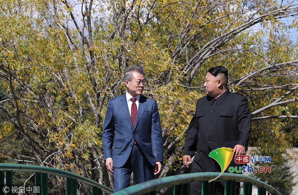 當?shù)貢r間2018年9月20日,朝鮮,韓國總統(tǒng)文在寅和朝鮮領(lǐng)導(dǎo)人金正恩在三池淵招待所共進午餐后散步。圖片作者:Yonhap News Agency/視覺中國