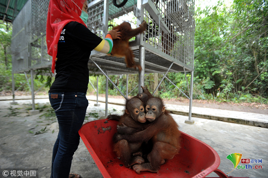 印尼加里曼丹克塔邦,國際動物救援(IAR)猩猩安全與保護中心里,飼養(yǎng)員用獨輪車把猩猩寶寶送到森林學(xué)校。圖片作者:Newscom