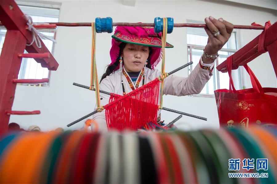 員工卓瑪在鹽湖鄉(xiāng)羌麥村民族手工編織廠工作(9月19日攝)。 2018年,西藏阿里地區(qū)革吉縣鹽湖鄉(xiāng)政府自籌資金成立羌麥村民族手工編織廠,編織廠將當?shù)貍鹘y(tǒng)手工編織技藝與市場需求相結合,生產手提包、圍脖、腰帶、毛毯、藏式頭巾等產品,并參加旅游推介活動,拓寬編織品銷售渠道,助力當?shù)鼐用衩撠殹?新華社記者 劉東君 攝