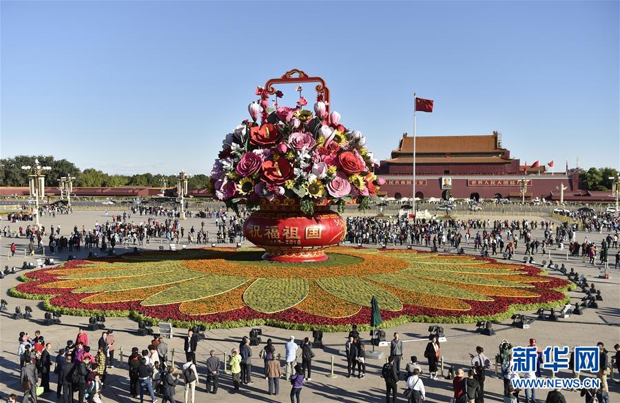 9月23日在北京天安門廣場(chǎng)拍攝的“祝福祖國(guó)” 巨型花籃。