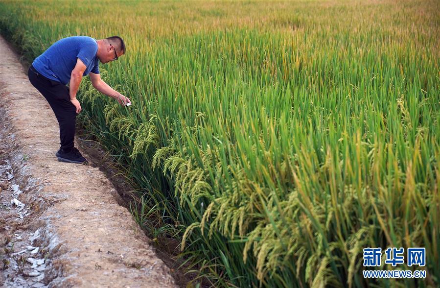 9月15日,北大荒集團七星農(nóng)場駐小崗村技術(shù)負(fù)責(zé)人趙明武在小崗村的北大荒集團現(xiàn)代化水稻生產(chǎn)基地檢查生物殺蟲卡。新華社記者才揚攝