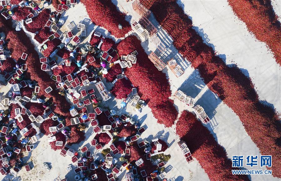 秋收時節(jié),吉林省白城市通榆縣的辣椒迎來豐收?;鸺t的辣椒和勞作的農(nóng)民構(gòu)成一幅幅美麗的豐收圖景。