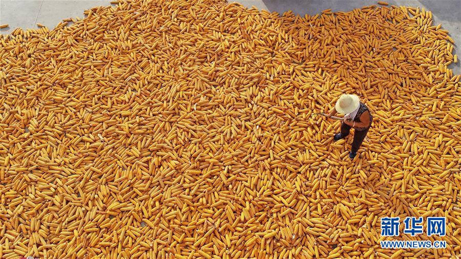 9月23日,河北省灤縣茨榆坨鎮(zhèn)西長坨村農(nóng)民在晾曬玉米(無人機拍攝)。