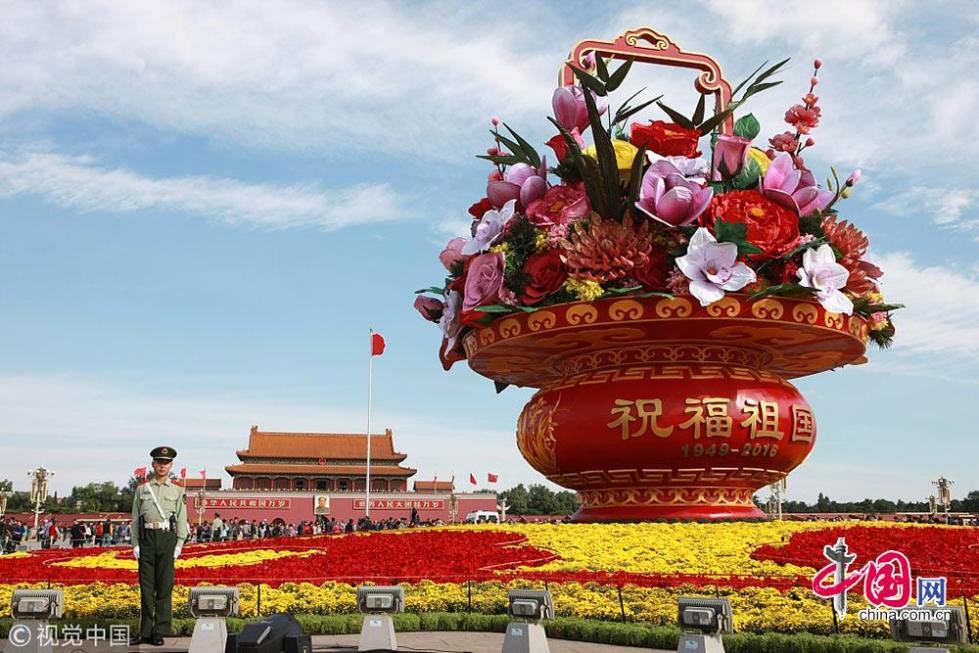 2016年天安門廣場大花籃籃體設(shè)計參考了清代畫家丁亮光“四季花籃”的畫作,花壇高17米,籃體高15.3米,直徑50米。籃中花材以牡丹、玉蘭、荷花、月季為主,配以“梅、蘭、竹、菊”等,籃體鑲嵌“祝福祖國”及“歡度國慶”文字以及1949-2016年號,表達對祖國繁榮富強、欣欣向榮的美好祝福。