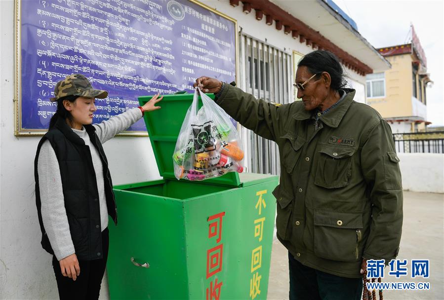 西藏阿里地區(qū)普蘭縣巴嘎鄉(xiāng)居民(右)在“垃圾銀行”兌換點工作人員指引下,將垃圾丟入分類箱中(9月13日攝)。 生活垃圾1袋可兌換胸牌1個,2袋可兌換鑰匙扣1個,可回收垃圾1袋可兌換抽紙1包或濕巾1袋……近日,記者在西藏阿里地區(qū)普蘭縣巴嘎鄉(xiāng)神山圣湖景區(qū)看到,一些游客領(lǐng)取環(huán)保袋在景區(qū)內(nèi)撿垃圾后,拿去兌換西藏特色紀(jì)念品。 這一切,得益于當(dāng)?shù)亻_設(shè)的“垃圾銀行”。今年6月,巴嘎鄉(xiāng)在神山圣湖景區(qū)開設(shè)“垃圾銀行”,鼓勵游客和群眾拾撿垃圾兌換獎品,破解景區(qū)垃圾收運難題,取得良好效果。 新華社記者劉東君攝