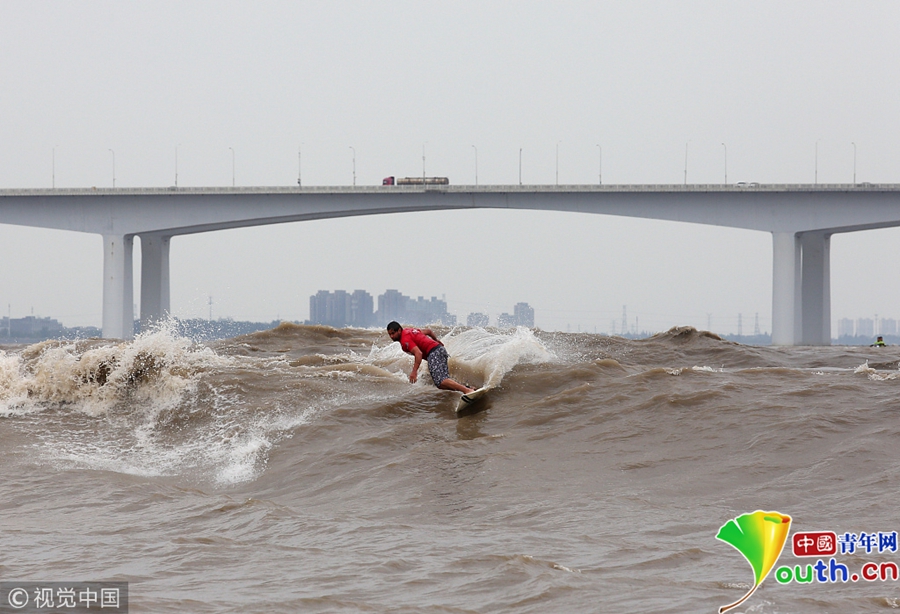 中國青年網北京9月27日電 2018年9月26日下午,杭州錢江江面上,一個個沖浪弄潮兒英姿颯爽。在錢塘江里戲浪前行的,正是參與錢塘江槳板精英賽的高手們。圖片作者/視覺中國