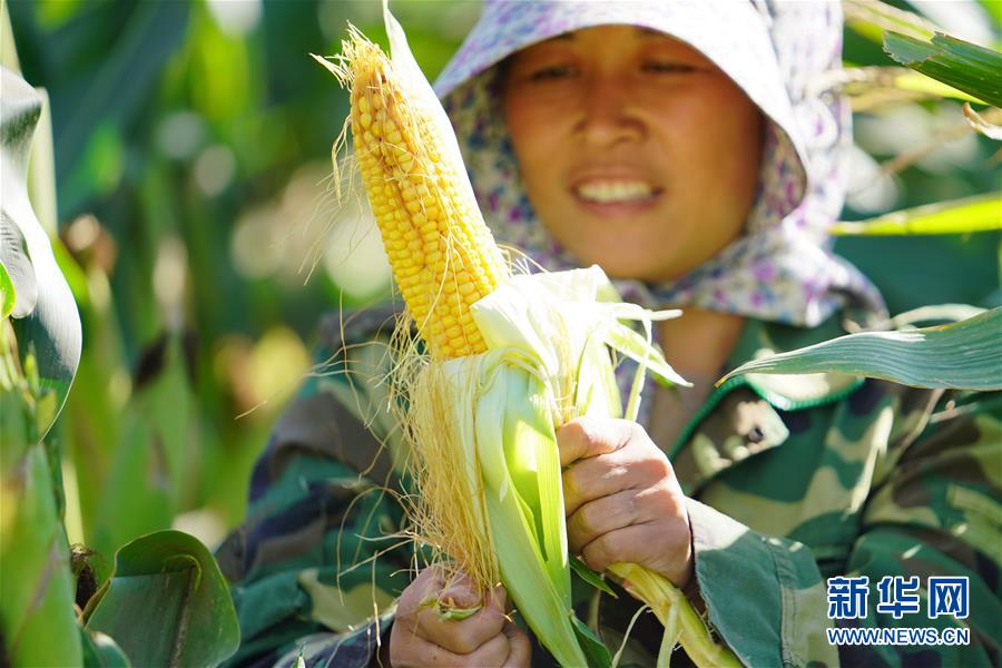 9月23日,河北省灤縣茨榆坨鎮(zhèn)西長坨村農(nóng)民賈麗萍在展示收獲的玉米。