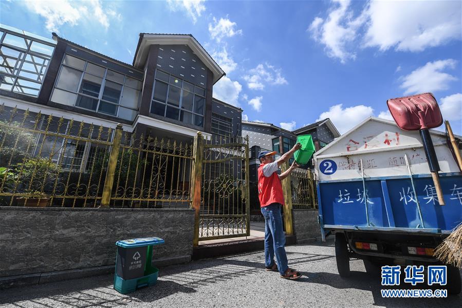 9月27日,小浦鎮(zhèn)合溪村垃圾分類清運員符正芳在清運村民門口的分類垃圾桶,同時他還要用手機上的垃圾分類APP進行掃碼簽到,確保每天每戶清掃到位。從9月初開始,浙江省長興縣小浦鎮(zhèn)推廣使用手機垃圾分類智能管理平臺。通過這款A(yù)PP可以進行村民垃圾分類情況打分、清運員每日簽到、監(jiān)督員巡查等,并能即時生成農(nóng)戶垃圾分類“成績單”,所有農(nóng)戶均可通過APP查詢垃圾分類排行榜,既方便又環(huán)保。新華社記者 徐昱 攝