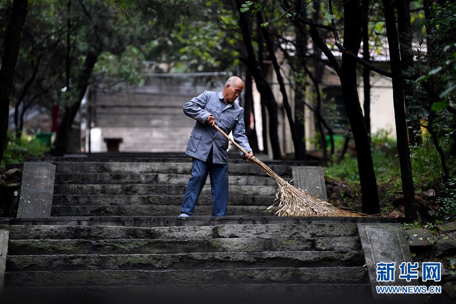 趙乃堂在打掃黃崖洞烈士陵園(9月20日攝)。 新華社記者 詹彥 攝