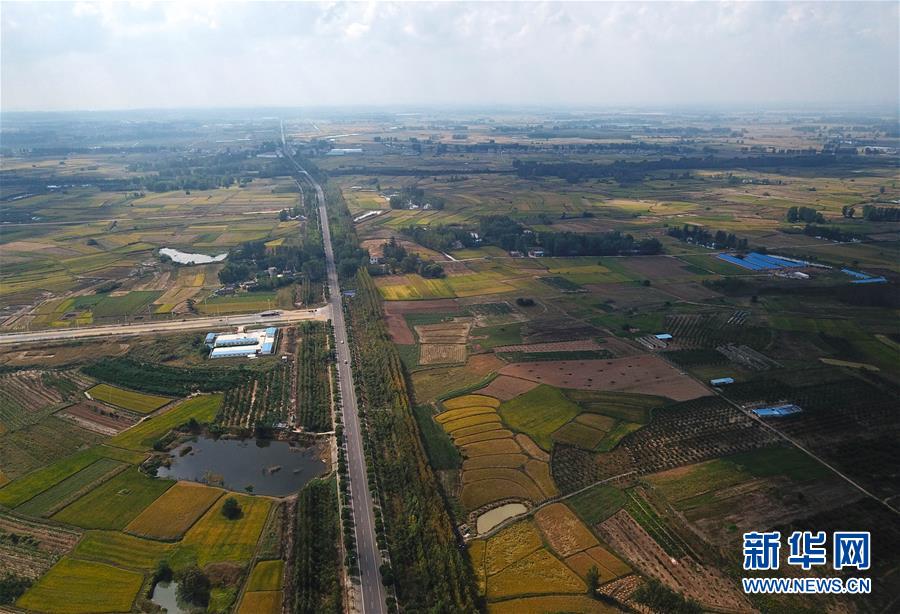 這是小崗村的稻田及公路(9月26日無人機拍攝)。