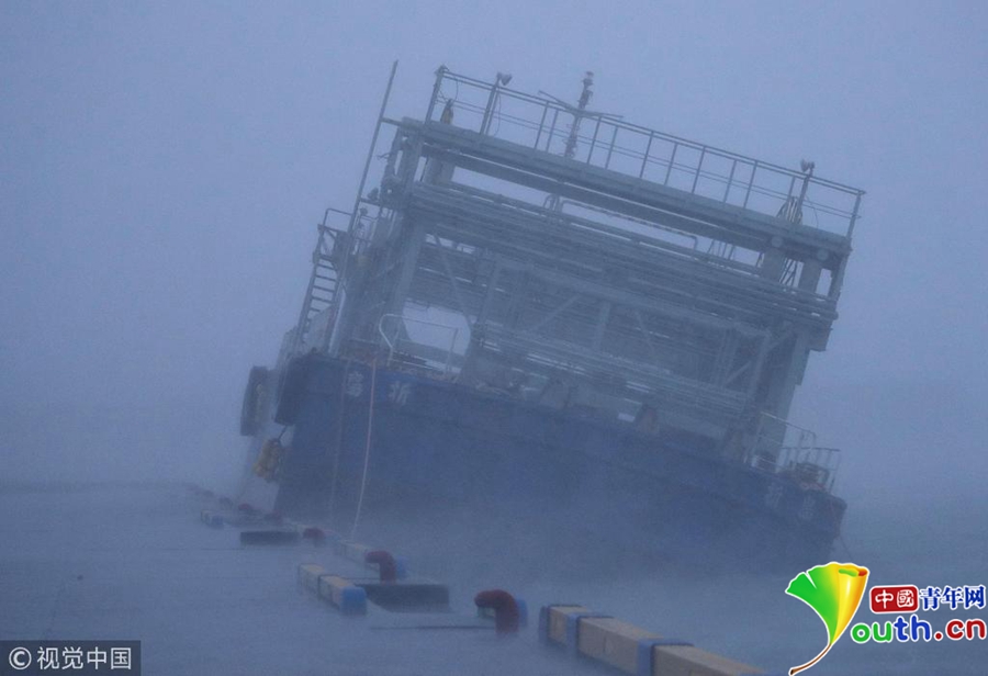 臺風“潭美”強勢襲擊日本 游船歪倒在岸邊
