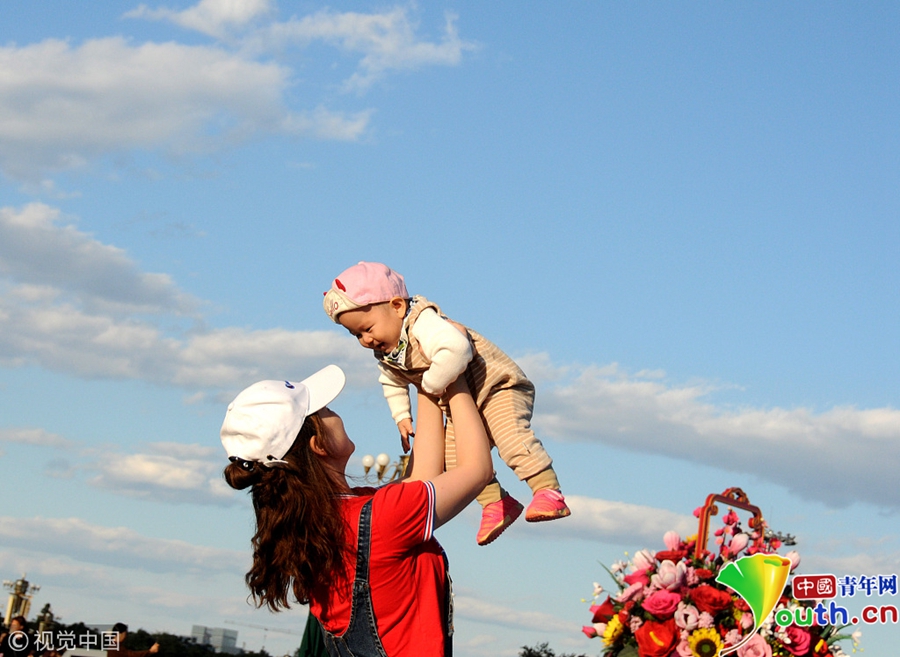 2018年9月29日,北京迎來高顏值好天氣,天安門廣場“祝福祖國”花壇在藍(lán)天白云映襯下壯美如畫。游客紛紛拿起手機(jī)、相機(jī)拍照留影充滿節(jié)日氣氛。