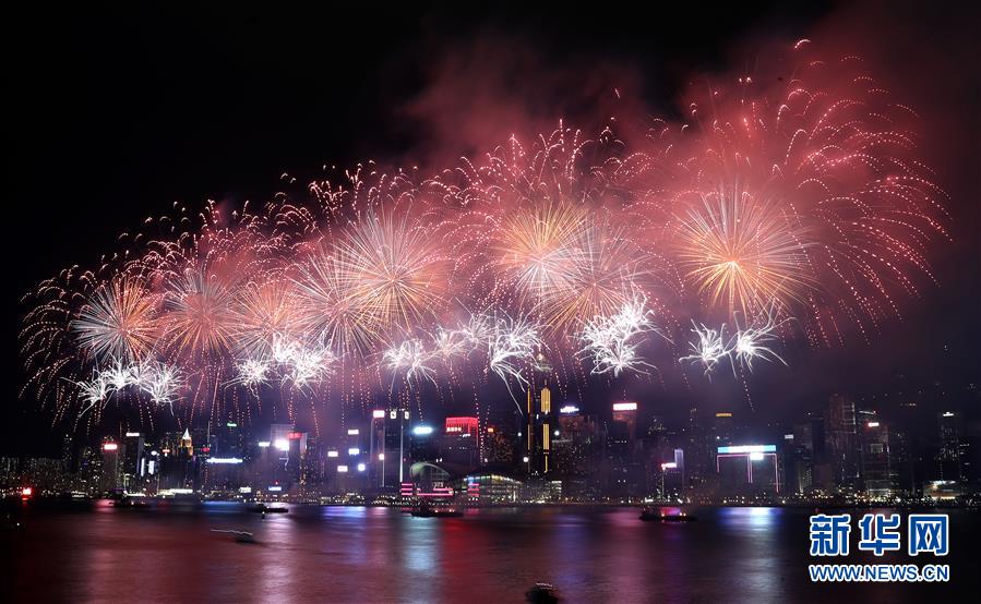 這是10月1日晚拍攝的香港維多利亞港煙花匯演。當(dāng)晚,香港維多利亞港舉行煙花匯演,慶祝中華人民共和國(guó)成立69周年。新華社記者李鋼攝