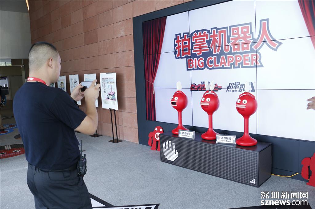 一名參觀者在拍掌機(jī)器人項(xiàng)目前拍照