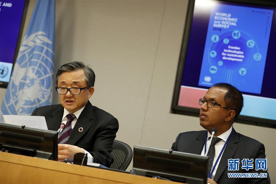 10月8日,在位于紐約的聯(lián)合國總部,聯(lián)合國負責經(jīng)濟和社會事務(wù)的副秘書長劉振民(左)向記者介紹《2018年世界經(jīng)濟和社會概覽》。新華社記者李木子攝