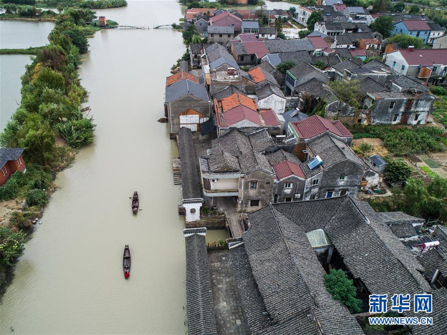 10月10日,泉家潭村村民劃著小船經(jīng)過沿河長廊(無人機(jī)拍攝)。經(jīng)過改造提升后,沿河長廊和整潔的古村街巷成為當(dāng)?shù)孛利愢l(xiāng)村的景觀帶。 新華社記者 徐昱 攝
