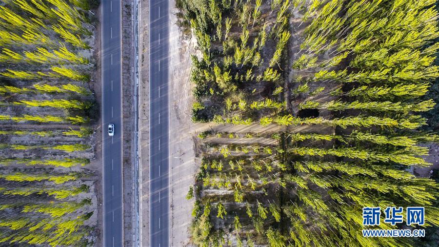 車輛行駛在新疆阿克蘇地區(qū)柯柯牙綠化工程核心區(qū)(9月20日無人機(jī)拍攝)。 在世界第二大流動性沙漠——塔克拉瑪干沙漠西北邊,一條逾百萬畝的人工林帶傲然挺立。 這條林帶就是柯柯牙荒漠綠化工程。它是新疆阿克蘇黃沙漫漫和碧波萬頃的分界嶺。 1986年,為改變惡劣的自然條件,阿克蘇啟動柯柯牙綠化工程。30年間,各族干部群眾攜手奮斗,曾是沙塵暴策源地的柯柯牙綠樹成蔭;并以此為原點,在南疆戈壁荒灘上孕育出百萬畝的“綠?!薄?30多年來,阿克蘇打造出“人走政不息”的樣本,使綠色發(fā)展理念成為幾代人的廣泛共識;“自力更生、艱苦奮斗、無私奉獻(xiàn)”的柯柯牙精神,已融入各族兒女血液中;“以林養(yǎng)林”“邊綠化邊脫貧”的綠化、脫貧方式,給其他荒漠地區(qū)貢獻(xiàn)了“柯柯牙智慧”。 新華社記者 胡虎虎 攝
