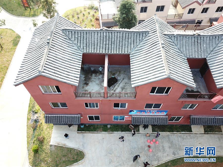 白褲瑤族同胞在廣西南丹縣里湖瑤族鄉(xiāng)移民集中安置點的新居前(10月11日無人機航拍)。新華社記者 周華 攝