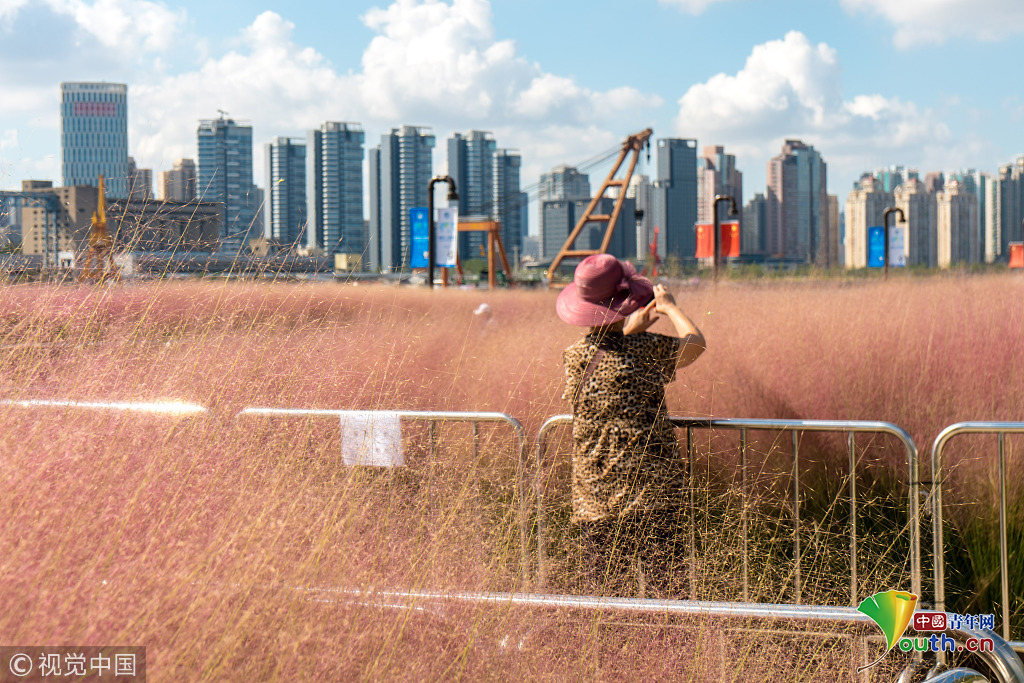 2018年9月28日,上海,東外灘楊浦濱江的粉黛亂子草目前已進入盛花期,當(dāng)日早間,不少市民來到濱江拍照賞景,成片的紫色花海在藍天白云映襯下美不勝收。圖片作者:王岡/視覺中國