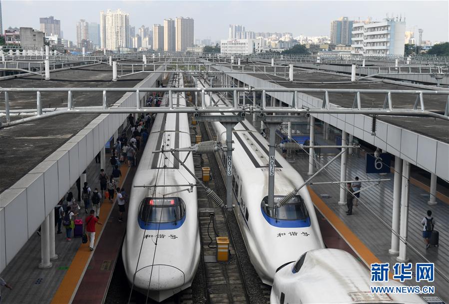 在廣西南寧站,旅客進入站臺準(zhǔn)備乘坐動車出行(9月4日攝)。 廣西壯族自治區(qū)成立60年來,鐵路建設(shè)發(fā)生翻天覆地的變化。來自中國鐵路南寧局集團有限公司的數(shù)據(jù)顯示,1958年廣西鐵路總里程為1346.3公里,如今廣西鐵路總里程達5191公里。廣西與周邊相鄰省份間實現(xiàn)動車“公交化”開行。此外,北部灣港—重慶班列、東盟海產(chǎn)品冷鏈班列、“百色一號”果蔬專列等的開通和運營,強化了鐵路供給的針對性和有效性。鐵路成為助推廣西經(jīng)濟社會快速發(fā)展的“大動脈”。 新華社記者陸波岸攝