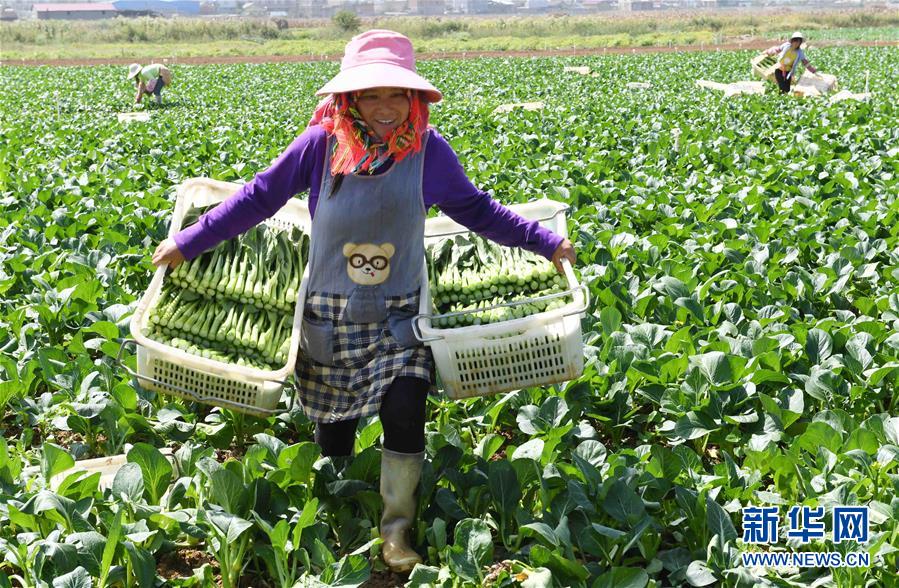 10月16日,硯山縣小補佐村的村民在種植基地收菜。 云南省文山壯族苗族自治州硯山縣稼依鎮(zhèn)小補佐村有55戶200多名壯族群眾曾經(jīng)居住在大山深處。2017年10月,在政府的幫扶下,小補佐村易地扶貧建設(shè)新村,村民全部搬遷入住新居。 新華社記者 楊宗友 攝