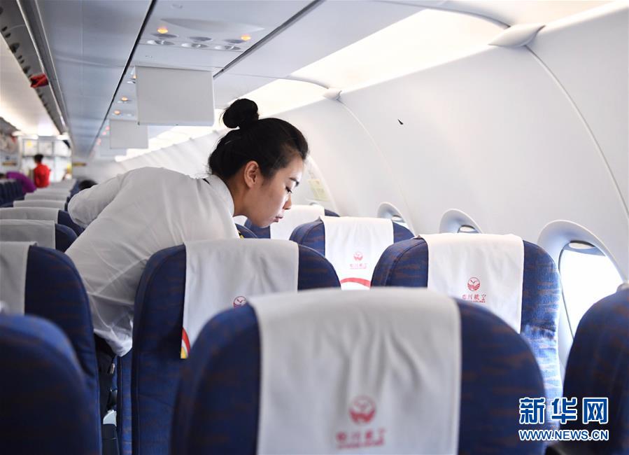10月16日,湯春燕對(duì)飛機(jī)客艙進(jìn)行安保檢查。 新華社記者王全超攝
