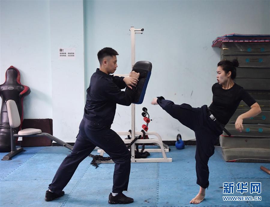 10月16日,湯春燕在健身房?jī)?nèi)進(jìn)行擒敵訓(xùn)練。 新華社記者王全超攝