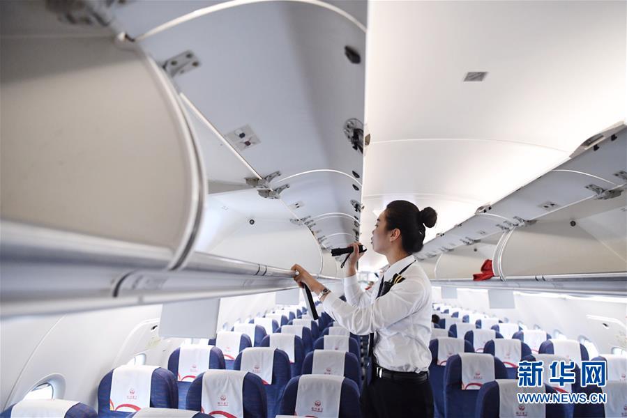 10月16日,湯春燕對(duì)飛機(jī)客艙進(jìn)行安保檢查。 新華社記者王全超攝