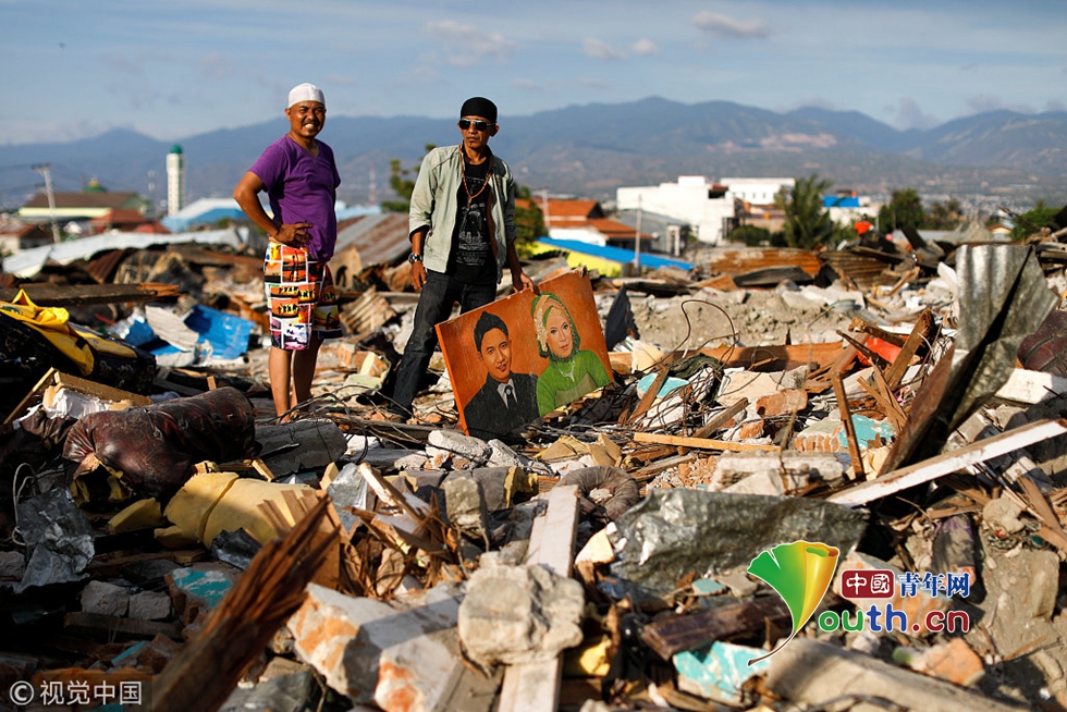 當(dāng)?shù)貢r(shí)間2018年10月7日,印尼帕盧,兩名男子從地震廢墟中找回他們?nèi)ナ栏改傅漠?huà)像。圖片作者:JORGE SILVA/視覺(jué)中國(guó)