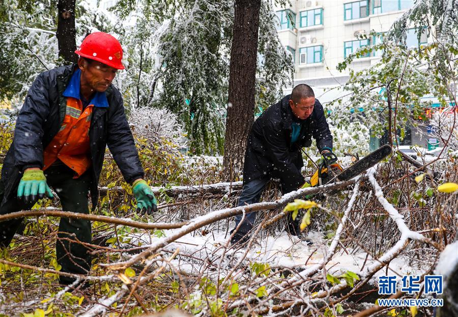10月18日,工作人員在烏魯木齊清理被積雪壓斷的樹木。當日,新疆烏魯木齊迎來一場降雪。 新華社記者 江文耀 攝
