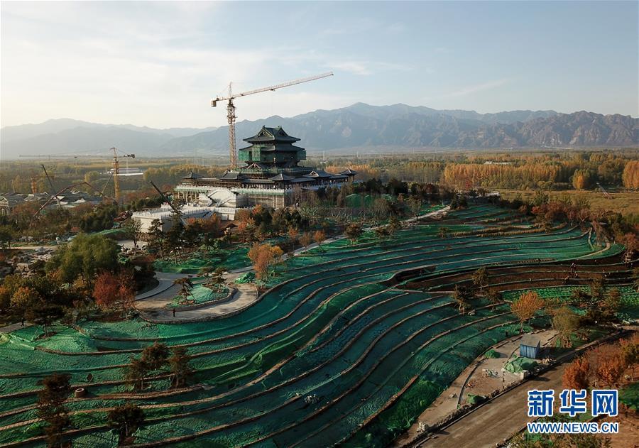 10月18日拍攝的建設中的北京世園會永寧閣(無人機拍攝)。 新華社記者 羅曉光 攝
