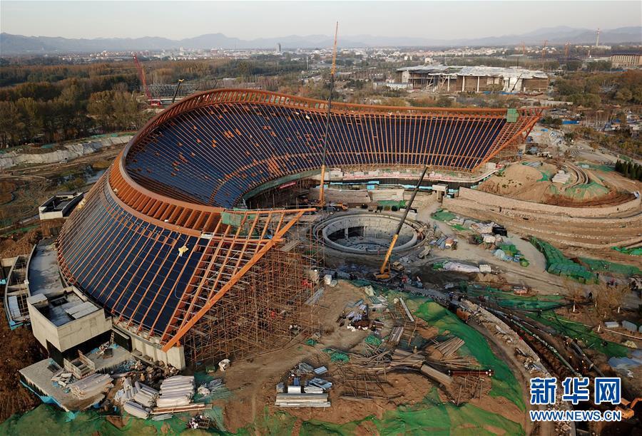 10月18日拍攝的建設(shè)中的北京世園會中國館(無人機(jī)拍攝)。新華社記者 羅曉光 攝