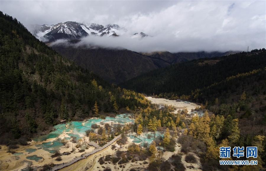 雪山、彩林、彩池構(gòu)成一幅色彩斑斕的畫卷(10月19日無人機拍攝)。深秋時節(jié),在雪山、藍天、白云和彩林映襯下,黃龍溝中的彩池色彩更加斑斕,目前黃龍景區(qū)進入觀賞最佳時節(jié)。黃龍風(fēng)景名勝區(qū)位于四川省松潘縣境內(nèi),以彩池、灘流、雪山、峽谷、森林等聞名,享有“人間瑤池”“圣地仙境”之美譽。新華社記者 江宏景攝