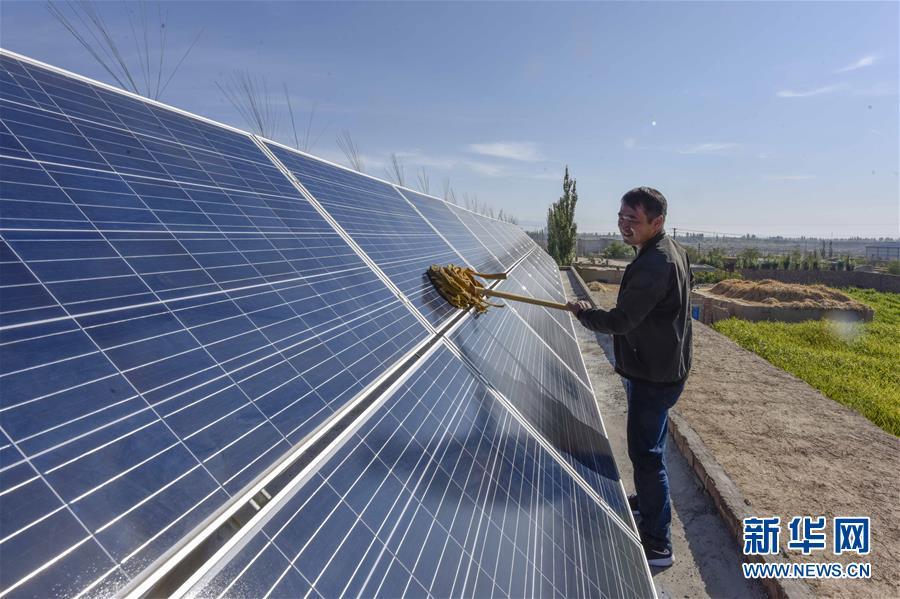 在新疆哈密市伊州區(qū)回城鄉(xiāng)鐵木爾提村,村民潘林琪打掃自家房頂上的太陽能發(fā)電板(2018年9月21日攝)。今年以來,新疆穩(wěn)步推進新能源參與“疆電外送”、擴大與燃煤自備電廠調(diào)峰替代交易等多種電力交易方式,著力破解“綠色電力”上網(wǎng)難題,新能源發(fā)電量同比增加近13個百分點,而棄電量和棄電比實現(xiàn)“雙降”,綠色發(fā)展理念進一步落實。新疆是我國重要的能源供應和儲備基地,風能、太陽能儲量豐富。近年來,新疆新能源裝機總量突破2700萬千瓦,規(guī)模和占比均居全國前列。新華社記者 趙戈 攝