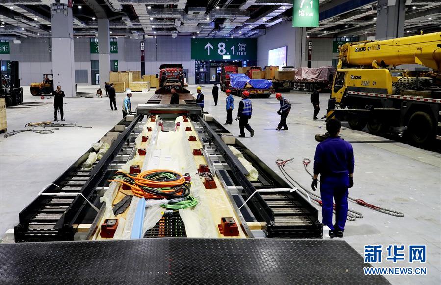 10月22日,“金牛座”龍門(mén)銑床床身(前)等待裝運(yùn)。 當(dāng)日,來(lái)自德國(guó)的首屆進(jìn)口博覽會(huì)最大展品——“金牛座”龍門(mén)銑床完成初步組裝,將運(yùn)往國(guó)家會(huì)展中心(上海)3號(hào)館進(jìn)行最后的安裝施工。這是德國(guó)瓦德里??票す狙邪l(fā)的機(jī)床設(shè)備,高約8米,占地面積約200平方米,將在智能及高端裝備區(qū)進(jìn)行展出。 新華社記者方喆攝
