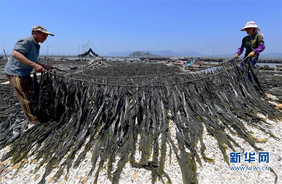 5月17日,在霞浦縣沙江鎮(zhèn)沙江村碼頭,養(yǎng)殖戶在晾曬海帶。
