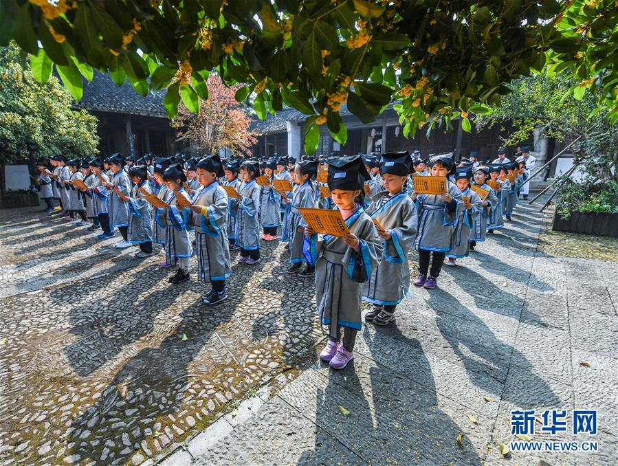 10月23日,學(xué)生們在老師的帶領(lǐng)下誦讀國學(xué)經(jīng)典。當日,浙江省長興縣第八小學(xué)舉行“誦家規(guī)家訓(xùn),傳中華美德”校園“誠敬日”主題教育活動,通過誦讀國學(xué)經(jīng)典、講勵志故事、演美德戲劇等形式,讓學(xué)生感受優(yōu)秀傳統(tǒng)文化。近年來,該學(xué)校立足“誠敬”文化,注重國學(xué)啟蒙教育,讓學(xué)生從小培養(yǎng)“以誠立身、以敬處事”的良好品質(zhì)。新華社記者 徐昱 攝