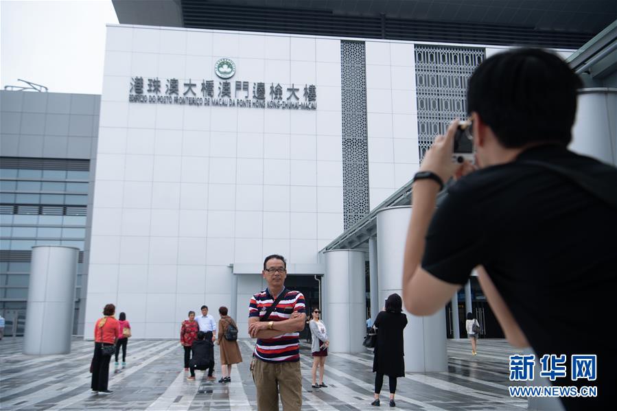 10月24日,市民在港珠澳大橋澳門邊檢大樓外拍照留念。 當日,港珠澳大橋正式通車。