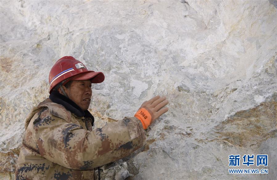 在昆侖山上海拔4000米的興發(fā)達(dá)玉礦,工程師田仲祥展示一塊正在開采的玉石礦體(10月23日攝)。 新華社記者武巍攝