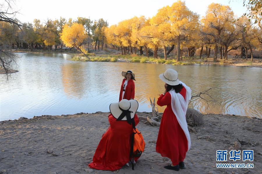 10月10日,在內(nèi)蒙古自治區(qū)額濟(jì)納旗,游客在胡楊林前留影。 金秋時節(jié),內(nèi)蒙古自治區(qū)額濟(jì)納旗胡楊林如同披上金裝,成為大漠中的一抹亮色,吸引眾多中外游客前來觀賞游玩。 新華社記者安希雅攝