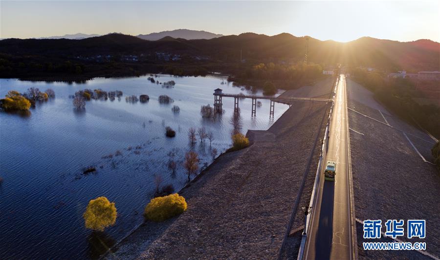 10月30日,一輛汽車行駛在北京密云水庫的大壩上(無人機拍攝)。