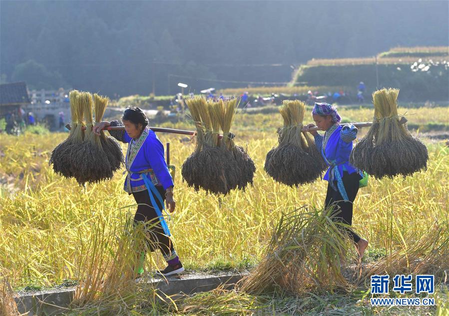 10月30日,在廣西融水苗族自治縣安太鄉(xiāng)元寶村,村民在收獲香糯。 新華社記者 吳建路 攝