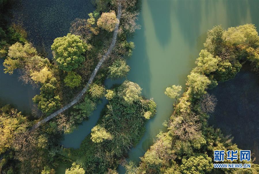 這是10月29日無(wú)人機(jī)拍攝的西溪濕地。杭州西溪濕地秋色漸濃,碧波黃葉相映成趣。 新華社記者翁忻旸攝