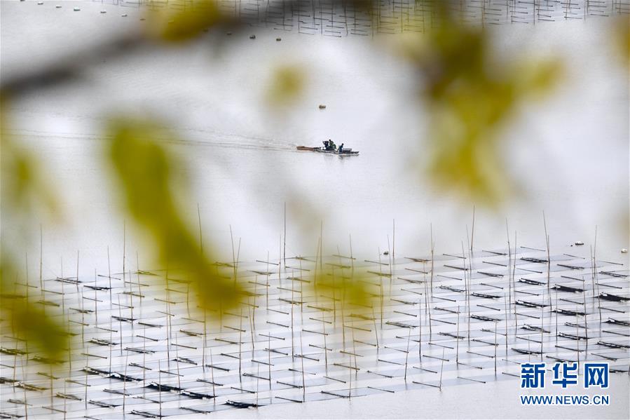 11月4日,漁民在霞浦縣三沙鎮(zhèn)的紫菜種植區(qū)收獲紫菜。 近日,福建省霞浦縣沿海6萬(wàn)畝紫菜迎來(lái)收獲季節(jié),漁民們出海收獲紫菜,海上田園一派繁忙豐收景象。 新華社記者 姜克紅 攝
