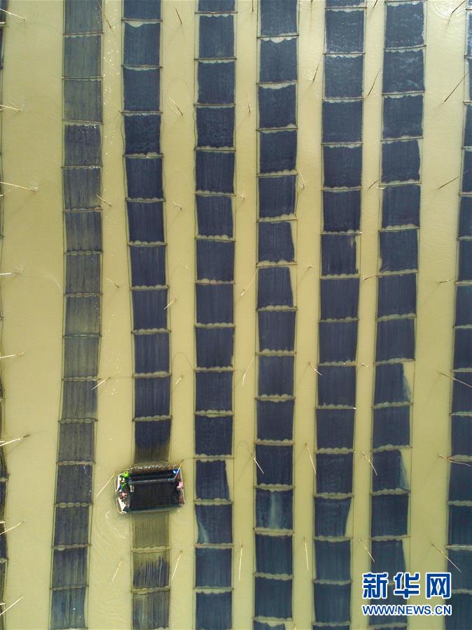 11月4日,漁民在霞浦縣三沙鎮(zhèn)的紫菜種植區(qū)收獲紫菜(無人機(jī)拍攝)。 近日,福建省霞浦縣沿海6萬畝紫菜迎來收獲季節(jié),漁民們出海收獲紫菜,海上田園一派繁忙豐收景象。 新華社記者 姜克紅 攝