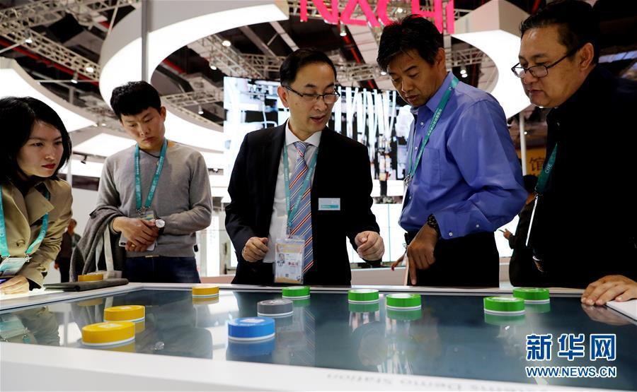11月5日,一名德國西門子展臺的工作人員(中)向參觀者講解分布式能源系統(tǒng)的工作原理。 新華社記者 方喆 攝