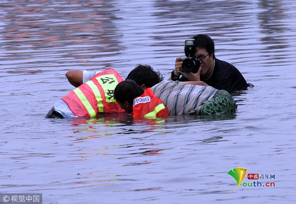 2007年8月6日,北京北三環(huán)安華橋雨后出現(xiàn)積水,這段北京最繁忙的道路之一的路段一度交通中斷,排險人員緊急趕到現(xiàn)場做出排水等應急舉措。圖片作者:王玨茜/視覺中國