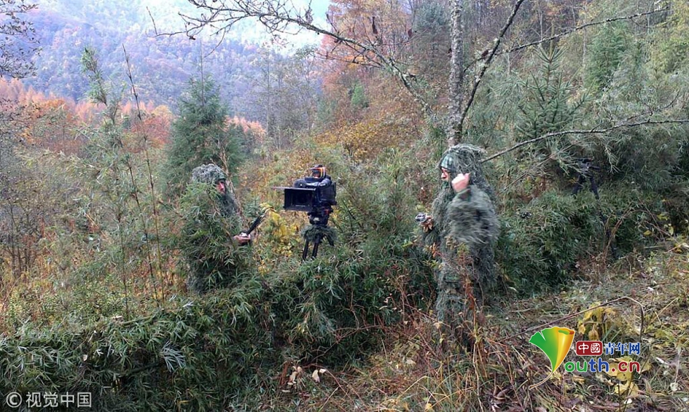 2013年11月6日,兩歲兩個月的雌性大熊貓“張想”在四川省雅安栗子坪自然保護區(qū)進行放歸,記者“全副武裝”在現(xiàn)場采訪。(手機拍攝)圖片作者:衡毅/視覺中國