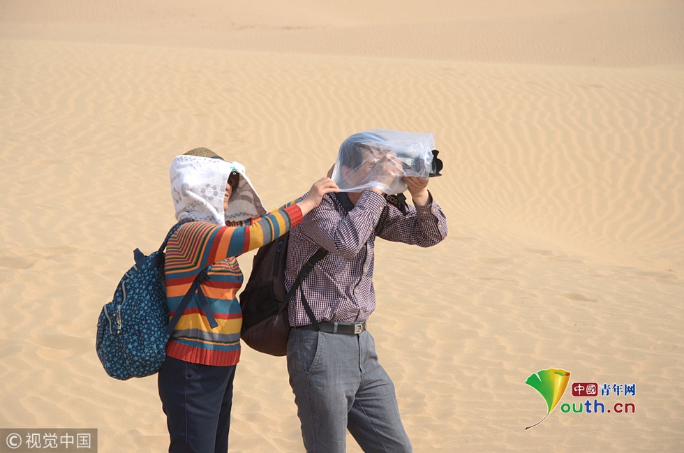 2013年05月05日,河北省張家口市,懷來天漠景區(qū)里的一名全副武裝的攝影師在風(fēng)中拍攝。 圖片作者:蘇衛(wèi)忠/視覺中國